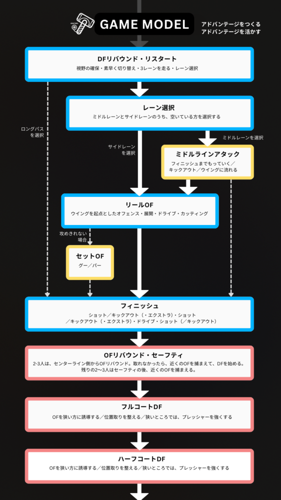 どのように戦うかが分かっても、そこに必要なスキルがなければ戦えない。そこでGame Modelを構築し、チームで共有。その局面ごとに必要なスキルを整理して、練習に落とし込んでいる。