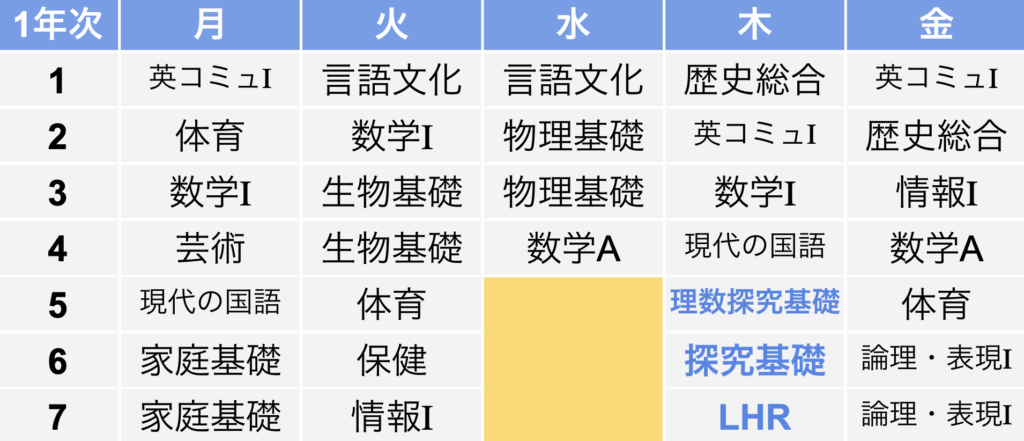 1年次の時間割イメージ(現時点で水曜の午後に設置予定)