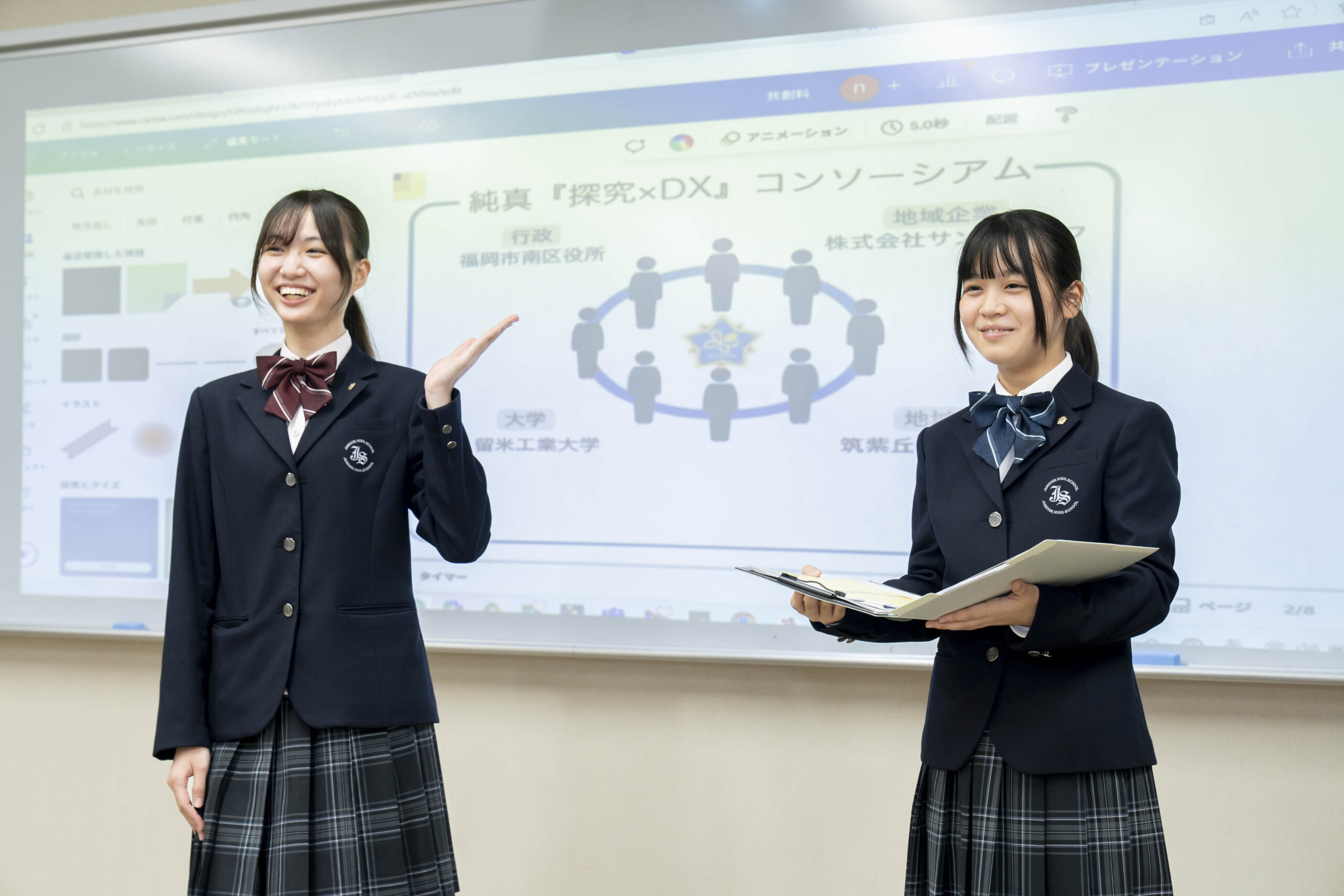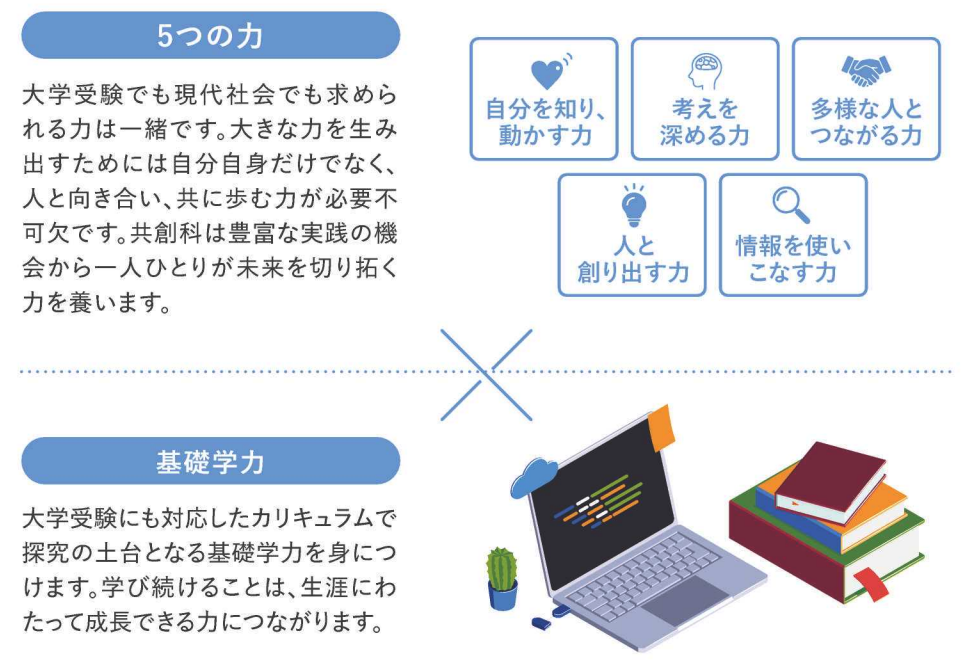 社会と「協奏」し実践力を鍛える、デジタルスキルを活用した「共創」、オリジナルの探究科目で仲間と「競争」。多様な「キョウソウ」であなたを開花させる!