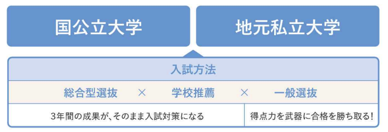 大学受験にも対応したカリキュラムで探究の土台となる基礎学力を身につけます。この基礎学力を活用して、共通テストなどの一般選抜入試への対応をします。
