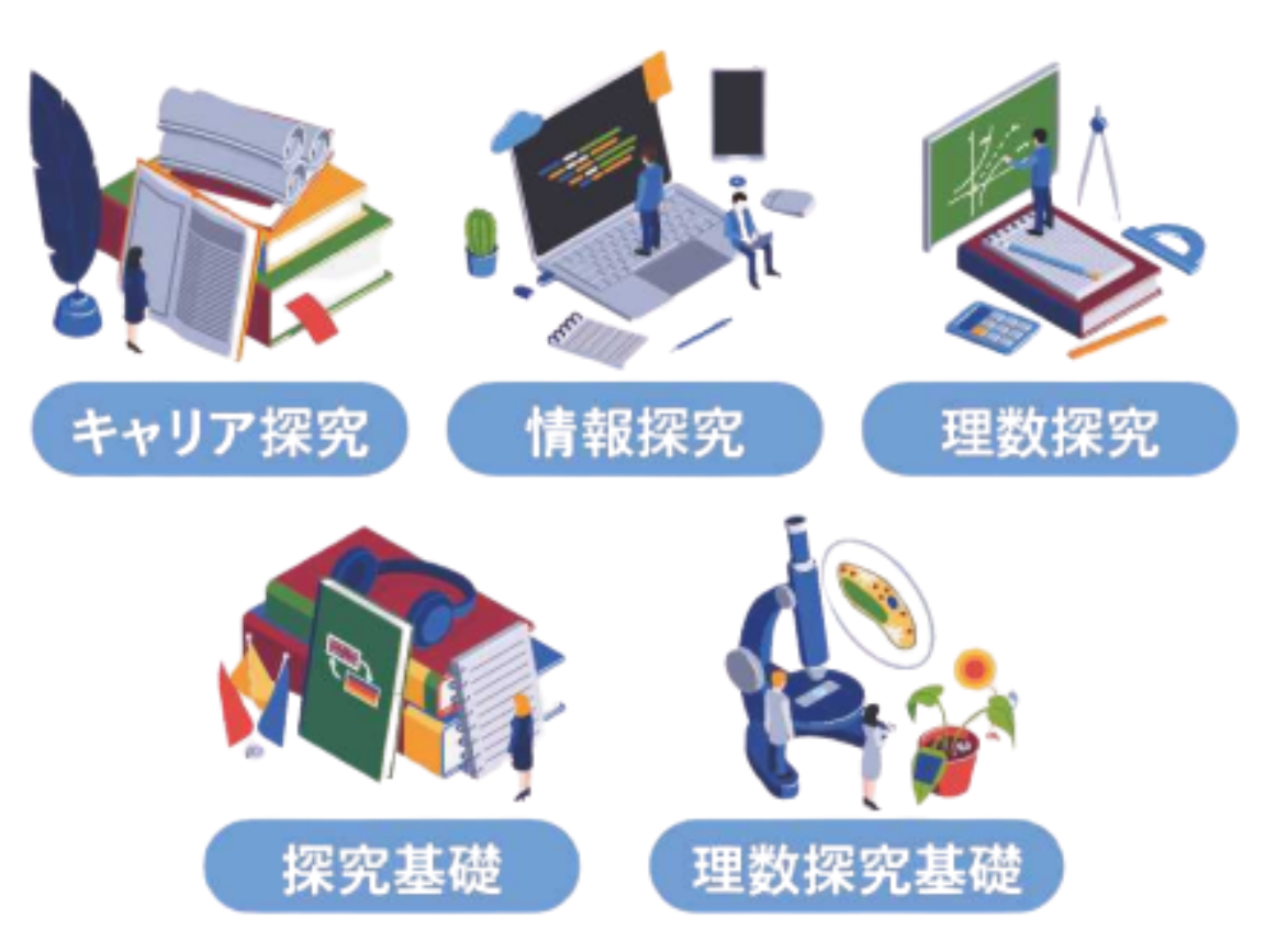 2年次以降では、現代社会で求められるデータ分析のスキルを育てる「情報探究」、働くことやお金の流れ、社会との関わりの中で探究する「キャリア探究」、そして、科学的に仮説と検証を重ねる「理数探究」で社会で求められる実践的スキルを習得します。