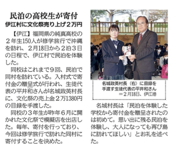 修学旅行のプログラムの1つとして、沖縄県伊江島に国内ホームステイをします。そんなお世話になっている伊江村へ、本校開催の文化祭の売上を寄付いたしました。
