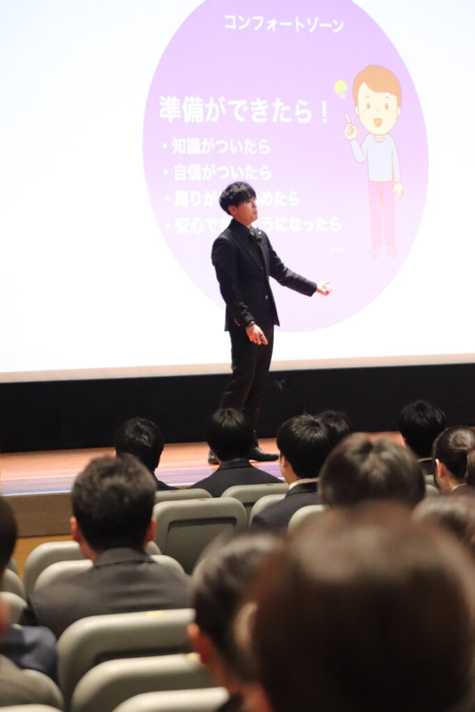 校長は、「一歩外の“ラーニングゾーン(挑戦の場)”に踏み出し、“ありたい自分”になりきって行動してほしい」と、生徒たちに力強いメッセージを届けました。