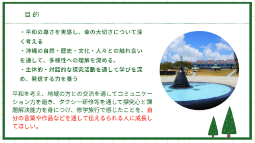 沖縄の自然・歴史・文化・人との出会いを通して、「平和の尊さを実感する」「命の大切さを深く考える」「対話と探究で学びを深める」「地域との交流から視野を広げる」