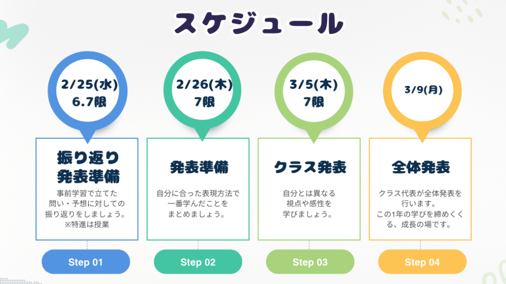修学旅行中の体験を振り返り、「自分は何を一番学んだのか」を整理し、伝えることをゴールとし、プレゼンスライド、セッション用のポスター、動画、CMなど様々な形式での成果物を作成していきます。そして、3月上旬の発表にて、最後の探究成果のアウトプットです。