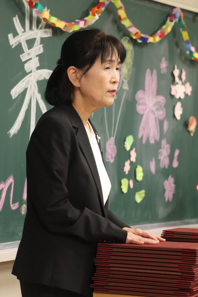 学びを共にした教室で、担任から改めて修了証書が一人ひとりに手渡され、それぞれの温かい言葉が添えられました。
