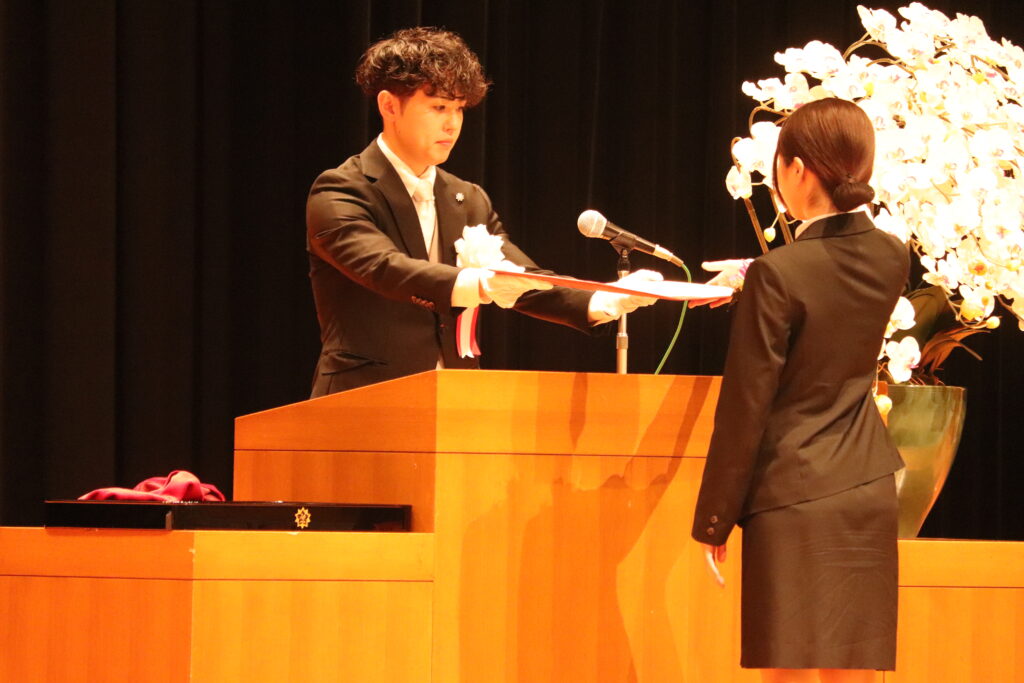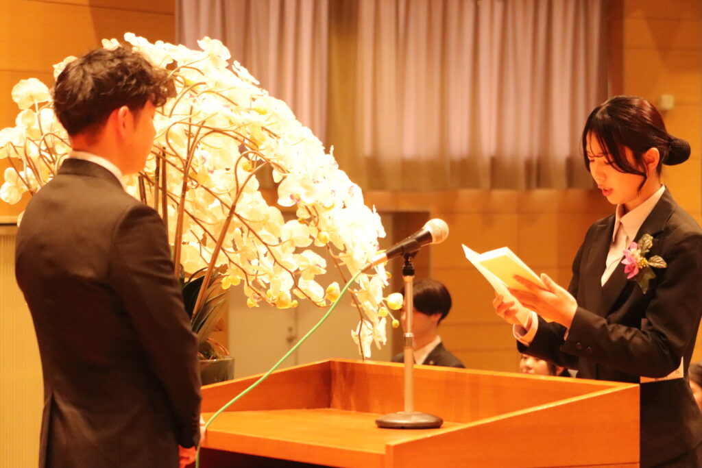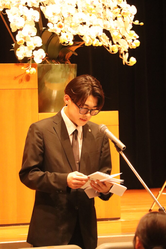 修了生代表は、5年間の厳しい学びの日々と、仲間や恩師、家族への感謝の思いを語りました。