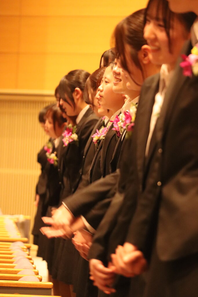 ピアノ伴奏は修了生の一人が担当し、会場にやさしい音色が響きました。修了生たちは手をつなぎ、体を揺らしながら、これまでの5年間の思いを込めて声を合わせました。仲間と過ごした日々を感じる、心に残るひとときとなりました。