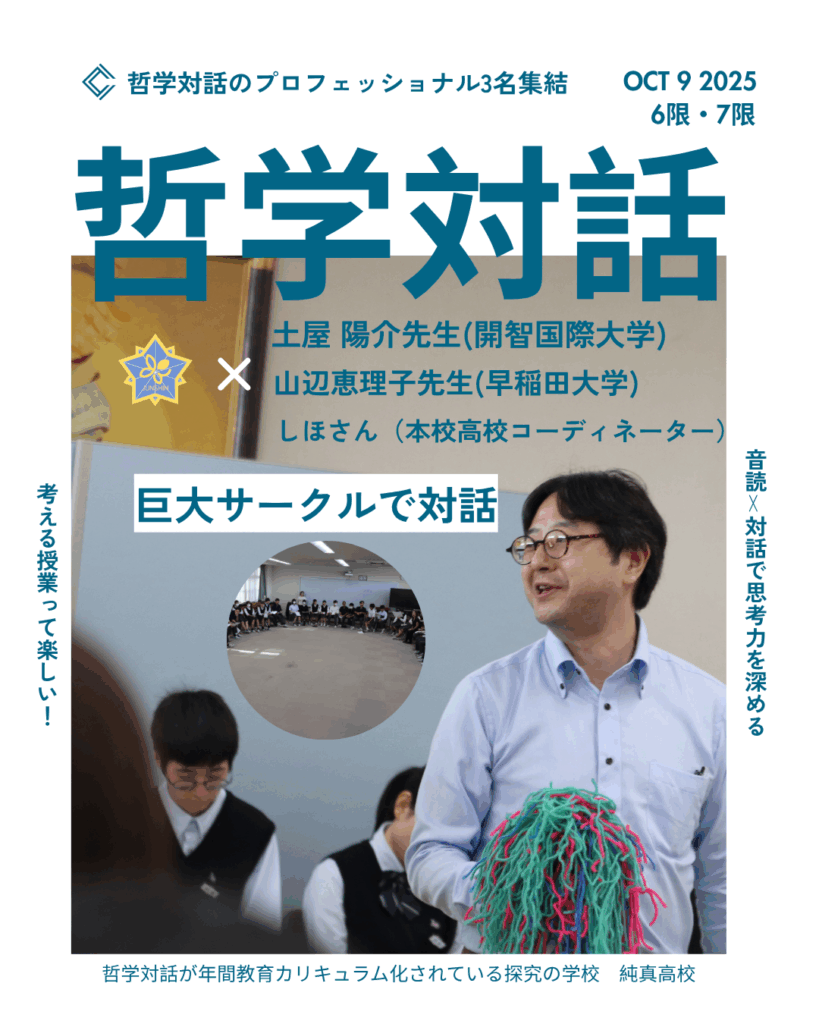 2025年10月9日、複数の大学より哲学対話のプロフェッショナルが来校。高校コーディネーターである哲学プラクティショナーしほさんとの3名体制でリードされる授業が行われました。