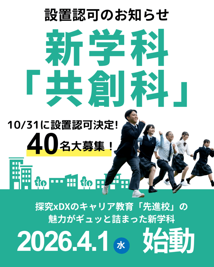 新学科「共創科」設置認可のお知らせ – 純真高等学校 2025年11月1日 最終更新日時 : 2025年11月5日 岡田 直也 このたび、2025年10月31日付で、純真高等学校は文部科学省、ならびに、福岡県の私学振興課より新学科「共創科」の設置認可を受けました。2026年度より、本校は新たな学びのかたちを創る一歩を踏み出します。 共創科について詳しく知りたい 共創科 2026年度から新学科「共創科」がスタートします。「課題解決」「新たな価値の創造」「社会貢献」など、その先にある多様な学びの目的を提供する学科です。 純真高等学校