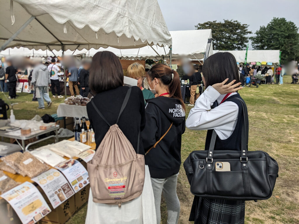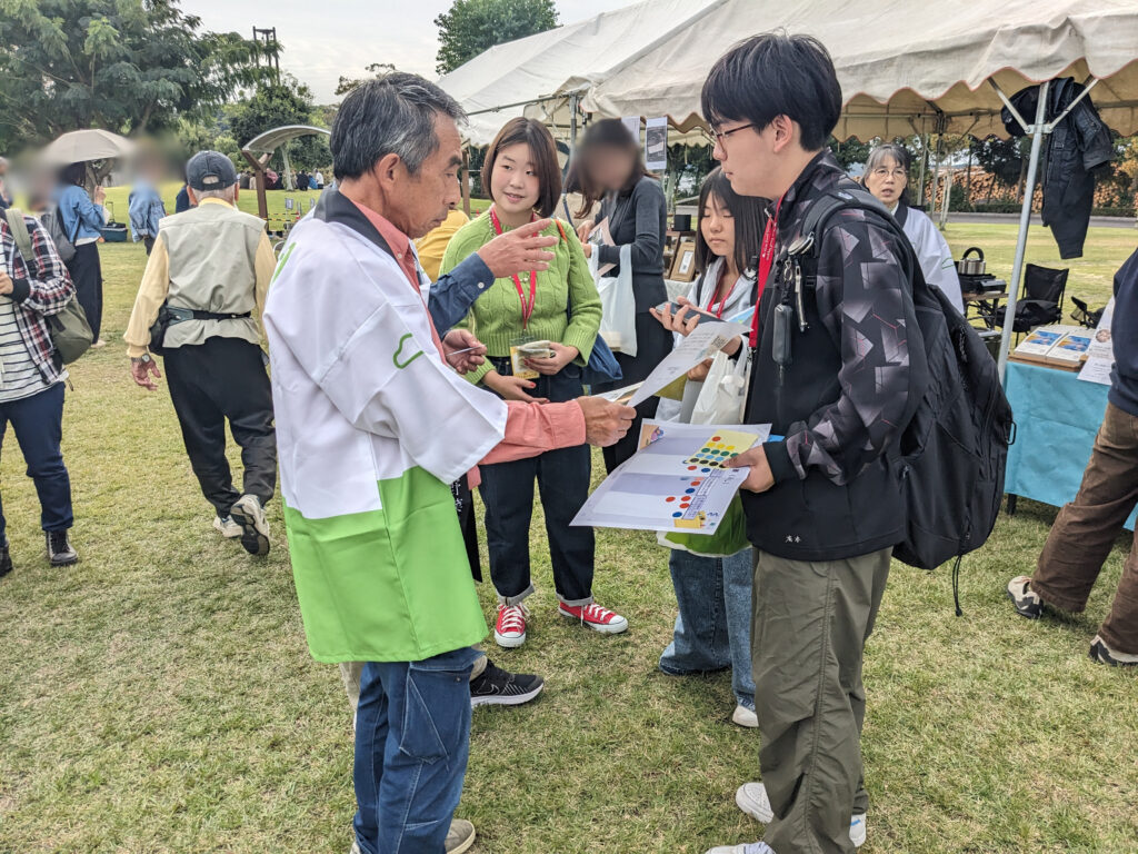 生徒たちは気になる生産者の方に声をかけては、熱心に話を聞いていました。生産者の皆さんも温かく答えてくださり、会話がどんどん広がっていました。