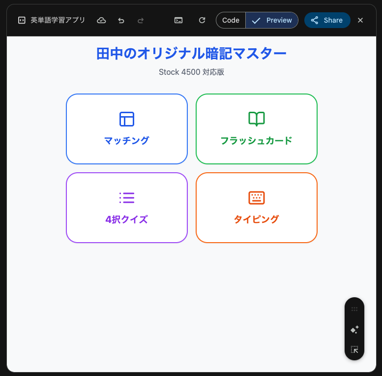 ただ単語暗記をして小テストをしてだとスイッチが入らない生徒にも、このアプリ制作をさせると、エンゲージメントが一気に高まり、どんな生徒も単語暗記を楽しめるようになる、とのこと。ちょっとしたキャッチボールでこんなに精度が高いアプリが作れることに驚きました。