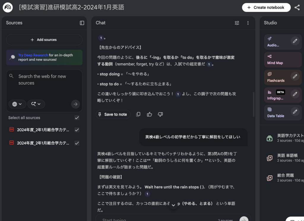 教科書・プリント・解説PDFをNotebook LMに読み込ませることで、「第〜問の問い・・・の解説をして」「〜ページの・・・のあたりがわからないから中学レベルで説明をして」のような軽い指示で、分かりやすい解説をしてくれました。